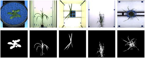 Examples of greenhouse image data including original and ground-truth segmented images. From left to right column: Arabidopsis (top view), maize (side view), maize (top view), barley (side view), barley (top view).