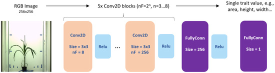 Unlike the image segmentation approach, an end-to-end model was trained to directly predict a single number (i.e., trait value) for each image bypassing the intermediate segmentation step. Figure 2 visualizes the general data flow for image analysis and evaluation of model performance. Accordingly, the accuracy of the end-to-end (i.e., image-to-trait) model was assessed using the ground-truth trait values and not the Dice (re. F-score) coefficient. Our end-to-end approach is based on a conventional architecture of a CNN model, including six hierarchical convolution layers of size 8, 16, 32, 64, 128, and 256 followed by two fully connected layers producing a single trait value in the final model output; see Figure 3. Table 2 gives a summary of the options used for the training of our e2e model, which was implemented under MATLAB R2024a (The MathWorks Inc., Natick, Massachusetts, USA). For all other options not mentioned in Table 2, default option values predefined by the MATLAB R2024a environment were used.