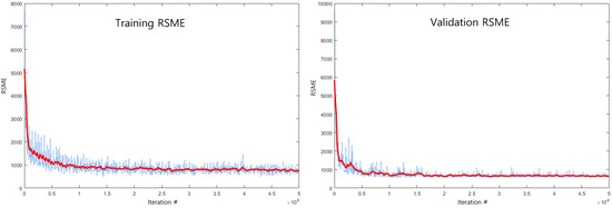Example of training and validation RSME losses of the end-to-end ‘projection area’ prediction model for a total of 10,000 iterations. Blue and red lines indicate original and smoothed performance curves, respectively. Due to the early saturation of the training curves, automated criteria for early stopping were introduced, resulting in a much lower number of approximately 1000 iterations.