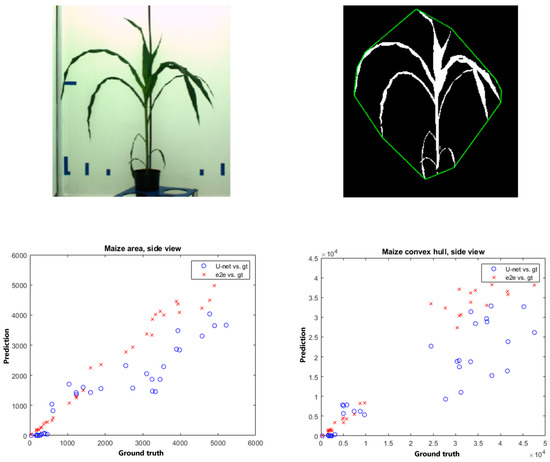 Exemplary comparison of maize shoot projection area and convex hull area using U-net vs. end-to-end trait prediction models. From left to right, from top to bottom: original side-view image of a maize shoot, segmented image of the maize shoot (white) with the boundary of the convex hull (green line), scatter plots of maize shoot projection area (bottom, left) and convex hull area (bottom, right) computed using the U-net segmentation vs. end-to-end trait prediction models. As one can see, the predictions of the segmentation-based approach undergo stronger deviations from the ground-truth values compared to the end-to-end predicted trait values.