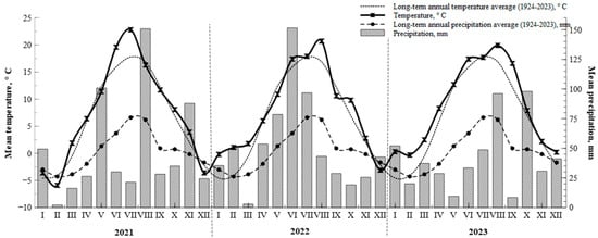 Meteorological conditions during the experiment (2021–2023) and the 100-year-long-term average.