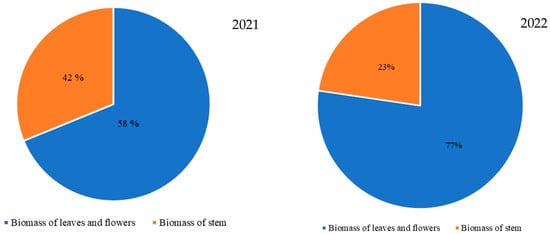 The difference in biomass yield between the years 2021 and 2022 could be affected by different weather conditions during the growing season. This is reflected in the warm and favorable precipitation conditions observed in 2021 (Figure 2), conditions known to promote biomass accumulation in hemp [42,43].