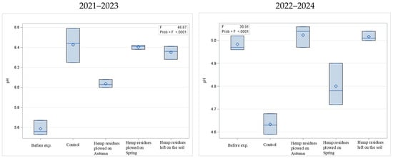 Soil pH changes before and after hemp residue application for the two experimental periods (2021–2023 and 2022–2024). Data are presented as means ± standard error; p < 0.05 between means, according to Tukey’s HSD test.