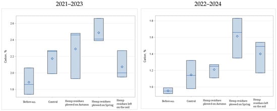 The results show a significant increase in carbon content when hemp residues were plowed into the soil in early spring. No further significant changes in carbon were found with other treatments (Figure 5). The 2021–2023 results showed that the soil carbon content increased after the experiment in treatments where hemp residues were incorporated in the soil in early spring and hemp residues were left on the soil surface (Figure 5). Furthermore, in the 2022–2024 experiment, the carbon content significantly increased under the same treatment (hemp residue plowed in the spring) (Figure 5). However, weather conditions strongly influenced this outcome, as the unusually dry summers of 2023 and 2024 inhibited residue decomposition. This has likely led to greater carbon accumulation in the soil, possibly due to reduced contact between residues and soil microorganisms, as well as limited decomposition during the winter period, and reduced microbial activity under dry and cold conditions.