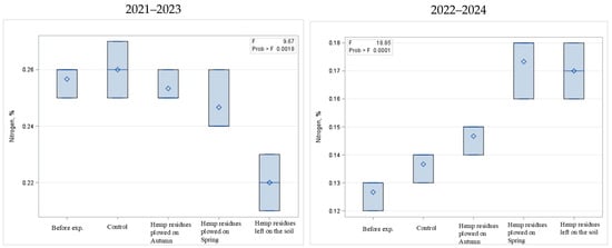 Nitrogen content in the soil before and after hemp residue application in the soil for the two experimental periods (2021–2023 and 2022–2024). Data are presented as means ± standard error; p < 0.05 between means, according to Tukey’s HSD test.