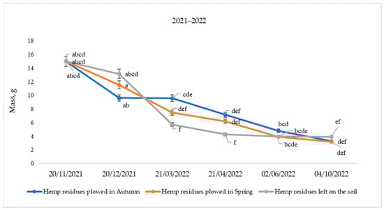 The rate of hemp residue mineralization in the year 2021–2022. Data are presented as means ± standard error; different letters correspond to significant differences (p < 0.05) between means, according to Tukey’s HSD test.