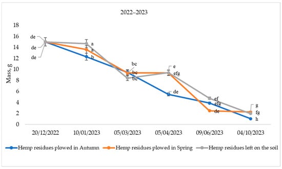 In 2022–2023, the first month (20/12/2022) after the establishment of the experiment, the results were similar to those observed at the beginning of the experiment in 2021–2022. The highest mineralization rate was found in the treatment where hemp residues were plowed in autumn. In contrast, the lowest mineralization rate occurred when the residues were left on the soil surface. There were, however, no significant differences between these two treatments. Four months (21/04/2022) after the establishment of the experiment, the mineralization of hemp residues was nearly equalized in all the treatments, with no significant differences observed. However, by the end of the experiment, the fastest mineralization was observed in the treatment where hemp residues were plowed in autumn. This treatment was significantly different from the other treatments (Figure 8).