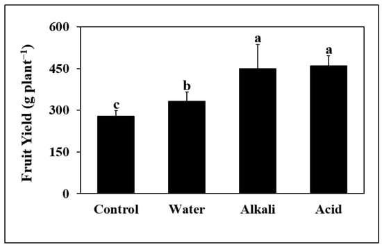 All SWE applications reduced the fruit pH compared to the control group (Table 2). The EC of homogenized tomato juice markedly increased when tomato plants were grown in soil treated with the experimental acid extract. Further significant increments were observed with the alkali and then with the water extract treatments. A similar trend was observed in Brix values in response to the SWE treatments. Compared to control, the Brix values of tomatoes harvested from acid, alkali, and water extract-treated plants were significantly improved by 15, 28, and 39%, respectively.