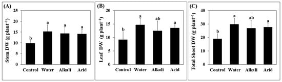 Effect of seaweed (C. barbata) extracts on (A) stem, (B) leaf, and (C) total shoot DW (g plant−1) of tomato (Solanum lycopersicum L. cv. Cuma F1) plants 100 days after transplantation. Values are means and standard deviations of five replicates. Different letters indicate significant differences between means according to Fisher’s protected LSD test (p < 0.05).