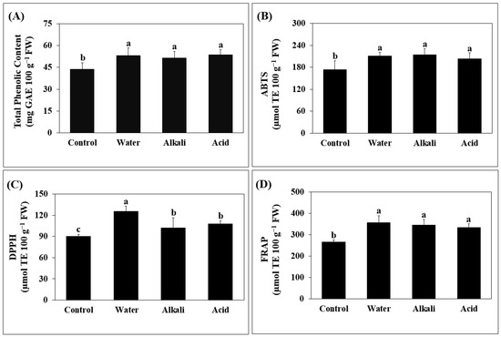 The concentrations of phenolics in the tested fruit samples and their antioxidant activities, as determined using ABTS, DPPH, and FRAP assays, are presented in Figure 3. All SWEs significantly elevated the TPC of tomato fruits to a similar extent (Figure 3A). The total antioxidant capacity assays showed results consistent with the TPC assay (Figure 3B–D). According to the ABTS and FRAP assays, all tested SWEs significantly enhanced the antioxidant capacity of tomato fruits to nearly the same level (Figure 3B–D). However, according to the DPPH assay, the water extract was even more effective than the other extracts in this respect (Figure 3C).