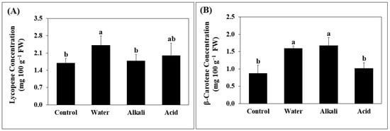 Lycopene and β-carotene concentrations in the fruits are presented in Figure 4. Compared to the control group, a significant increase in lycopene concentration was observed only in plants treated with the water extract of C. barbata (Figure 4A). The β-carotene levels in fruits from water- and alkali extract-treated plants nearly doubled, whereas those in fruits from acid extract-treated plants remained unaffected (Figure 4B).
