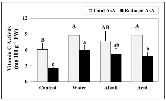 Both the total and reduced vitamin C concentrations were enhanced by the tested C. barbata extract applications (Figure 5). Significant increases of up to 50% in total AsA concentration of tomato fruits were observed upon water and acid extract treatments. The increases observed for reduced AsA were even more pronounced and ranged between 80% and 130%, with the highest concentration measured in fruits harvested from water extract-treated plants.