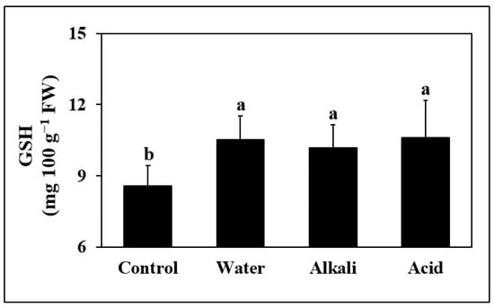 Seaweed extract treatments had significant positive effects on the GSH concentration in tomato fruits, as shown in Figure 6. Regardless of the seaweed extraction method, the GSH concentrations in fruits increased by 24% compared to the control group.