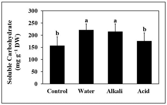 The total soluble carbohydrate concentrations of tomato fruits are shown in Figure 7. When tomato plants were grown in the soil treated with water or alkali extract of C. barbata, fruits had 39% more soluble carbohydrates than control fruits. However, in the acid extract-treated group, the total soluble carbohydrate concentration remained unchanged.