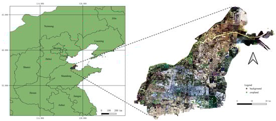 The Yellow River Delta is located in the northeast of Shandong Province, adjacent to the Bohai Sea to the north and Laizhou Bay to the east. The study area, comprising Dongying District and Kenli District of Dongying City, is located between 36°55′ N and 38°10′ N latitude and 118°12′ E and 119°19′ E longitude, covering an area of approximately 10,400 square kilometers. This region, within the mid-latitude zone, experiences a warm, temperate continental monsoon climate with cold winters, hot summers, and well-defined seasons. The region has an average annual temperature of 12.8 °C, with precipitation and evaporation averaging 555.9 mm and 1885 mm per year, respectively. The frost-free period lasts approximately 206 days annually [26]. The predominant soil type in the area is saline and alkali soil, with about 52.11% of the land being arable and suitable for agricultural development. The cropland, which is neatly arranged, is primarily found in the central–northern and southwestern parts of the region, where the main crops are wheat, corn, and cotton [27].