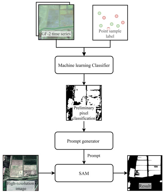 The flowchart of extracting cropland parcels based on the improved SAM is depicted in Figure 3. The initial machine learning classifier, trained on sparse time series point samples, generates cropland classification binary images. In the second stage, preliminary binary classification images are processed by an automatic prompt generation module to create SAM-compatible prompts (points, boxes, masks). Despite the unperfect prompt source, this OpenCV-based prompt generation module simulates manual prompt input to create effective crop-specific semantic prompts while excluding non-cropland objects. Ultimately, the generated prompts, along with high-resolution imagery, are processed by SAM to automatically segment the image and extract cropland parcels without manual prompt input. The workflow requires only sparse point samples to train the initial classifier, as the prompt generation module spares pixel-level mask annotations and extra training during cropland extraction.