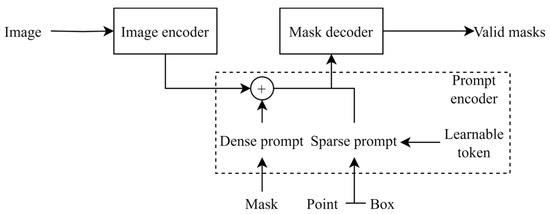 The Segment Anything Model (SAM), introduced by Meta, is a foundational interactive image segmentation model that can generate segmentation results guided by manual prompt inputs, including points, masks, bounding boxes, and text, without requiring additional training samples [32]. This model is primarily made up of three key components: an image encoder to process visual data, a prompt encoder to handle input prompts, and a mask decoder to generate the segmentation masks (see Figure 4).
