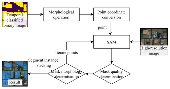 The transformed point coordinate serves as a point prompt to guide the SAM to extract a cropland parcel instance containing a mask, a prediction intersection over union (IoU) score, and the minimum outer rectangle from the high-resolution imagery. These parameters will be used as the foundation for morphological filtering and quality filtering to achieve high-quality cropland land extraction.