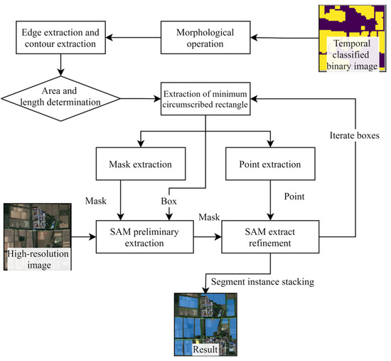 The SAM supports three types of prompts: box, mask, and point prompts, whereas the above Auto module only utilizes point prompts, although the extraction process is relatively simple. However, the roles of the dense prompt mask and box prompts is ignored. The proposed Box Prompt Generation Module (Box module) employs all three prompts to extract the cropland hierarchically. In the first stage, the SAM performs preliminary cropland extraction under point and mask prompts, while in the second stage, point prompts support the SAM’s refining of the results from the first stage. The flowchart of the Box module is shown in Figure 6.