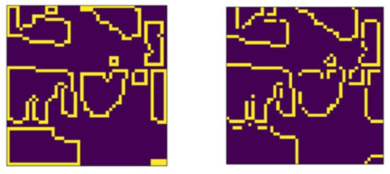 Comparison of edge extraction methods (the left is four-neighborhood edge extraction, and the right is the Canny edge extraction operator. The yellow pixel field value is 1, which is the edge pixel, and the black pixel field value is 0, which is the non-edge pixel.).
