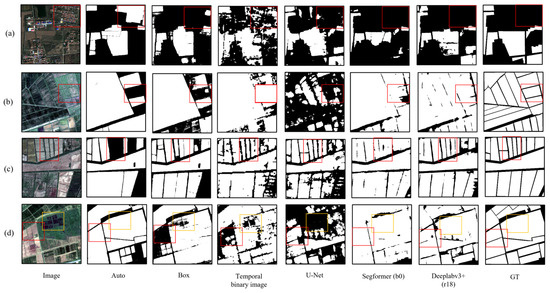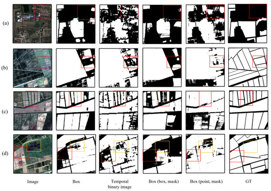 Comparison of the cropland extraction results of different models for the test slices (the temporal binary images reflect the accuracy of the generated prompts, and GT represents ground truth labels). (a–d) show the cropland extraction results of four test slices, the white region represents “cropland” while the black represents “background”.