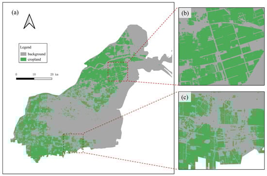 The Box module SAM cropland extraction results. (a) presents the extracted cropland parcel in the study area. (b,c) show spatial details of the extracted cropland parcel.