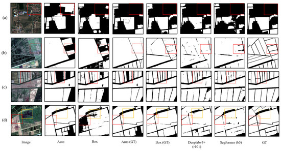 All of the aforementioned comparison models utilized small-parameter versions (Segfomer_b0, Deeplabv3+_r18), employing the AdamW [37] optimizer with a learning rate of 0.0006 and a batch size of 1. Sixty sheets from the cropland dataset were selected as the training set, and the remaining twenty sheets were used for testing. These were then compared with the SAM integrating the Box module and the Auto module, in order to facilitate a performance comparison.