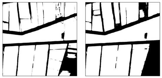 The influence of morphological operations on the Box module SAM’s cropland extraction (the left figure does not use morphological operations; the right figure uses two erosion operations and one dilation operation, in turn).
