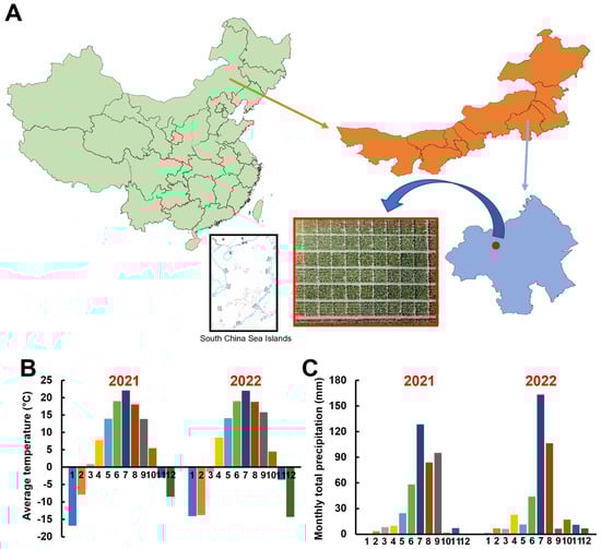 Experimental site location (A), monthly average temperature (B), and total monthly precipitation (C) in 2021–2022.