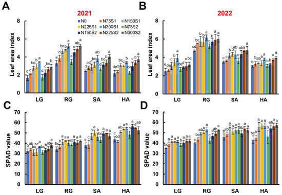 The effects of nitrogen application levels (N0, N75, N150, N225, and N300) and methods (S1 and S2) on the leaf area index (LAI) and chlorophyll content of sugar beet at different growth stages (LG, RG, SA, and HA). (A,B) The LAI of sugar beet in 2021 and 2022. (C,D) The SPAD values of sugar beet leaves in 2021 and 2022. Error bars represent standard deviations. Different lowercase letters indicate statistically significant differences between treatments (p ≤ 0.05). Rapid leaf growth (LG) stage; root growth (RG) stage; sugar accumulation (SA) stage; harvest (HA) stage.
