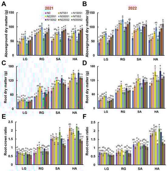 Effects of nitrogen application levels (N0, N75, N150, N225, and N300) and methods (S1 and S2) on dry matter accumulation and root-crown ratio in sugar beet at different growth stages (LG, RG, SA, and HA). (A,B) Aboveground dry matter accumulation per plant in 2021 and 2022. (C,D) Root dry matter accumulation per plant in 2021 and 2022. (E,F) Sugar beet root–crown ratio in 2021 and 2022. Error bars represent standard deviations. Different lowercase letters indicate statistically significant differences between treatments (p ≤ 0.05). Rapid leaf growth (LG) stage; root growth (RG) stage; sugar accumulation (SA) stage; harvest (HA) stage.