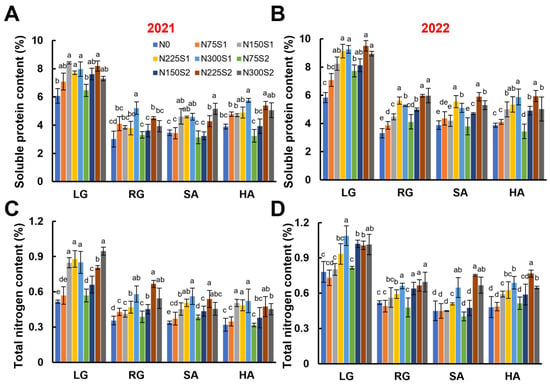Effects of nitrogen application levels (N0, N75, N150, N225, and N300) and methods (S1 and S2) on root nitrogen metabolism in sugar beet at different growth stages (LG, RG, SA, and HA). (A,B) Root soluble protein content in 2021 and 2022. (C,D) Root total nitrogen content in 2021 and 2022. Error bars represent standard deviations. Different lowercase letters indicate statistically significant differences between treatments (p ≤ 0.05). Rapid leaf growth (LG) stage; root growth (RG) stage; sugar accumulation (SA) stage; harvest (HA) stage.