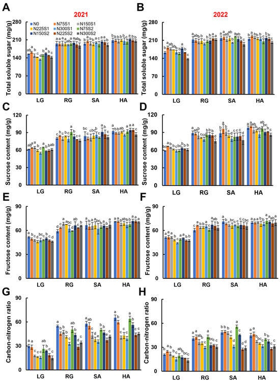 Effects of nitrogen application levels (N0, N75, N150, N225, and N300) and methods (S1 and S2) on root carbon metabolism and carbon–nitrogen ratio in sugar beet at different growth stages (LG, RG, SA, and HA). (A,B) Root total soluble sugar content in 2021 and 2022. (C,D) Root sucrose content in 2021 and 2022. (E,F) Root fructose content in 2021 and 2022. (G,H) Root carbon–nitrogen ratio in 2021 and 2022. Error bars represent standard deviations. Different lowercase letters indicate statistically significant differences between treatments (p ≤ 0.05). Rapid leaf growth (LG) stage; root growth (RG) stage; sugar accumulation (SA) stage; harvest (HA) stage.