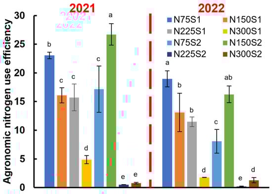 Effects of nitrogen application levels (N0, N75, N150, N225, and N300) and methods (S1 and S2) on agronomic nitrogen use efficiency. Different lowercase letters indicate statistically significant differences between treatments (p ≤ 0.05).