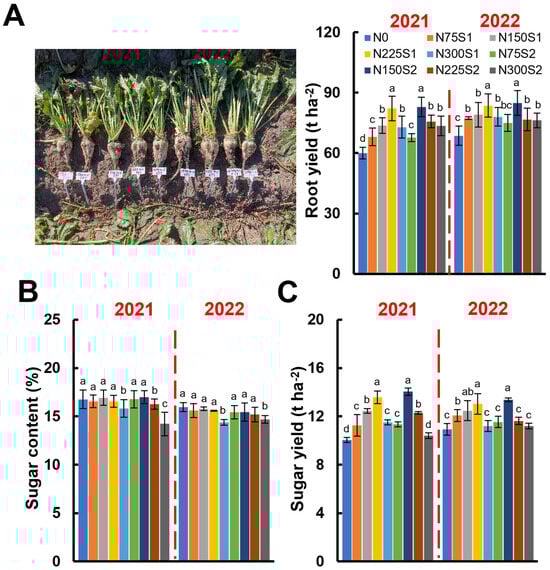 The effects of nitrogen application levels (N0, N75, N150, N225, and N300) and methods (S1 and S2) on sugar beet root yield, sugar content, and sugar yield. (A) The root yield in 2021 and 2022. Representative images of sugar beet plants from each treatment are presented. In the figures, the sugar beet plants are displayed sequentially from left to right, representing the N0, N75S2, N75S1, N150S1, N150S2, N225S1, N225S2, N300S1, and N300S2 treatments. (B) The sugar content in 2021 and 2022. (C) The sugar yield in 2021 and 2022. The error bars represent the standard deviations. Different lowercase letters indicate statistically significant differences between treatments (p ≤ 0.05).