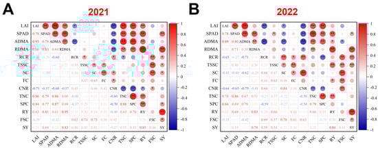 Correlation analysis between physiological parameters, yield, and the quality of sugar beet under different nitrogen application levels (N0, N75, N150, N225, and N300) and methods (S1 and S2). (A) Correlation analysis conducted in 2021. (B) Correlation analysis conducted in 2022. LAI: leaf area index; ADMA: aboveground dry matter accumulation; RDMA: root dry matter accumulation; RCR: root–crown ratio; TSSC: total soluble sugar content; SC: sucrose content; FC: fructose content; CNR: carbon–nitrogen ratio; TNC: total nitrogen content; SPC: soluble protein content; RY: root yield; FSC: final sugar content; SY: sugar yield. * indicates p ≤ 0.05, and ** indicates p ≤ 0.01.