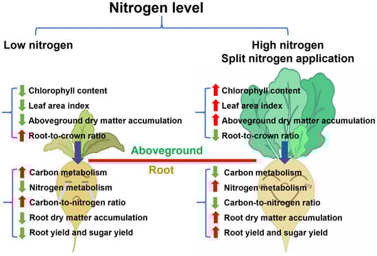 A summary of the effects of nitrogen application levels and methods on sugar beet growth, carbon and nitrogen metabolism, and yield. The diagram summarizes effects under low versus high/split nitrogen treatments. Blue arrows indicate the transport of photosynthetic products; red and green arrows represent increased and decreased indicators measured in this study, respectively.