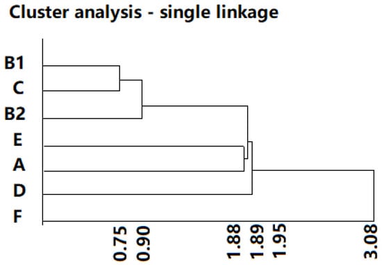 Cluster analysis [21] shows that Farms B1 and C are the most similar, which is justified by their similar farm areas and production (quantity). Farm B2 integrates this first group, although not so closely. These companies have subsistence farming activities and sell to local businesses.