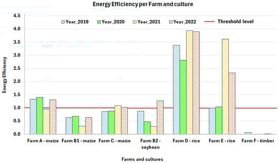As previously presented for Farm B2 (Table 3) the energy efficiency trajectory and energy balance for soybean cultivation between 2019 and 2022 suffered particular variations. During 2020, the energy balance dropped significantly to −16,421.68 MJ, and energy efficiency decreased to 0.47. This downturn could be attributed to the impact of the COVID-19 pandemic, which disrupted crop management capacity and agricultural practices more broadly. Restrictions on movement, coupled with reduced availability of labour and raw materials, likely hindered normal farm operations.