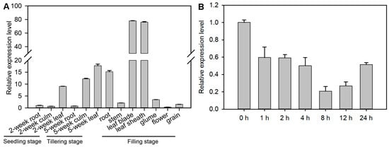 The expression of OsVPS16 was examined in various tissues, including root, stem, leaf, leaf sheath, glume, flower, and grain, using RT-qPCR. The results revealed that OsVPS16 expression was highest in leaves and lowest in roots during the seedling and tillering stages (Figure 1A). At the filling stage, OsVPS16 expression remained highest in the leaves and lowest in flowers. To explore the role of OsVPS16 in salt stress response, its expression was analyzed in rice roots following salt (NaCl) treatment over a time gradient. The expression of OsVPS16 decreased under salt stress, reaching its lowest level at 8 h post-treatment (Figure 1B). And after 8 h of salt treatment, the expression of OsVPS16 was down-regulated to 2.26-fold compared to the untreated control.
