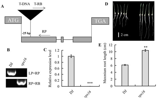 The T-DNA mutant vps16 displays a long root phenotype. (A) Schematic representation of the T-DNA insertion site in OsVPS16. (B) PCR analysis of the T-DNA insertion site in vps16. Upper bands: OsVPS16 gene fragments; lower bands: T-DNA insertion fragments. (C) qRT-PCR analysis of OsVPS16 expression in DJ and vps16 plants. (D) Root phenotypes of 4 d old DJ and vps16 plants. Bar, 2 cm. (E) The maximum root length of the plants is shown in (D). Asterisks indicate a significant difference, where ** and *** indicate p < 0.01 and p < 0.001 level, respectively.
