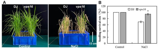 Rice is particularly vulnerable to salt stress during the seedling stage [9]. Previous studies have shown that salt stress inhibits rice growth, delays the rice growth process, and accelerates plant senescence [10,51]. In this study, salt stress inhibited the growth of both wild-type (DJ) and vps16 seedlings, but the growth inhibition was less severe in the vps16 mutant compared to DJ (Table 1, Figure 3A). In addition, the vps16 mutant showed a higher survival rate under salt stress than DJ (Figure 3B). These results show that the vps16 mutant has better salt tolerance.