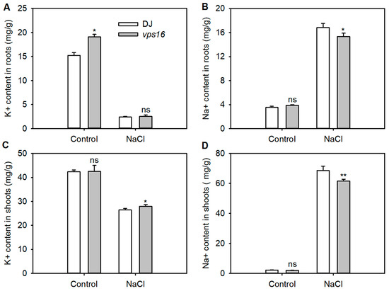 To evaluate the effect of OsVPS16 on ion homeostasis, Na+ and K+ contents were measured in shoots and roots after 5 d of treatment with 0 and 150 mM NaCl. Salt stress significantly reduced K+ content, and increased Na+ content in both shoots and roots of DJ and vps16 plants, compared to the non-salt control (Figure 4). Under salt stress, Na+ contents in the roots and shoots of vps16 plants were significantly lower than in DJ (Figure 4B,D). Additionally, the K+ content in shoots of the vps16 plant was significantly higher than that of DJ, while no significant difference was observed in the roots (Figure 4A,C).