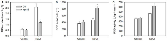 Physiological analyses of the T-DNA insertion mutant and WT plants under salt stress. (A) MDA contents, (B) SOD activity, and (C) POD activity of roots from WT and vps16 mutants following 150 mM NaCl treatment. * indicates p < 0.05 level.