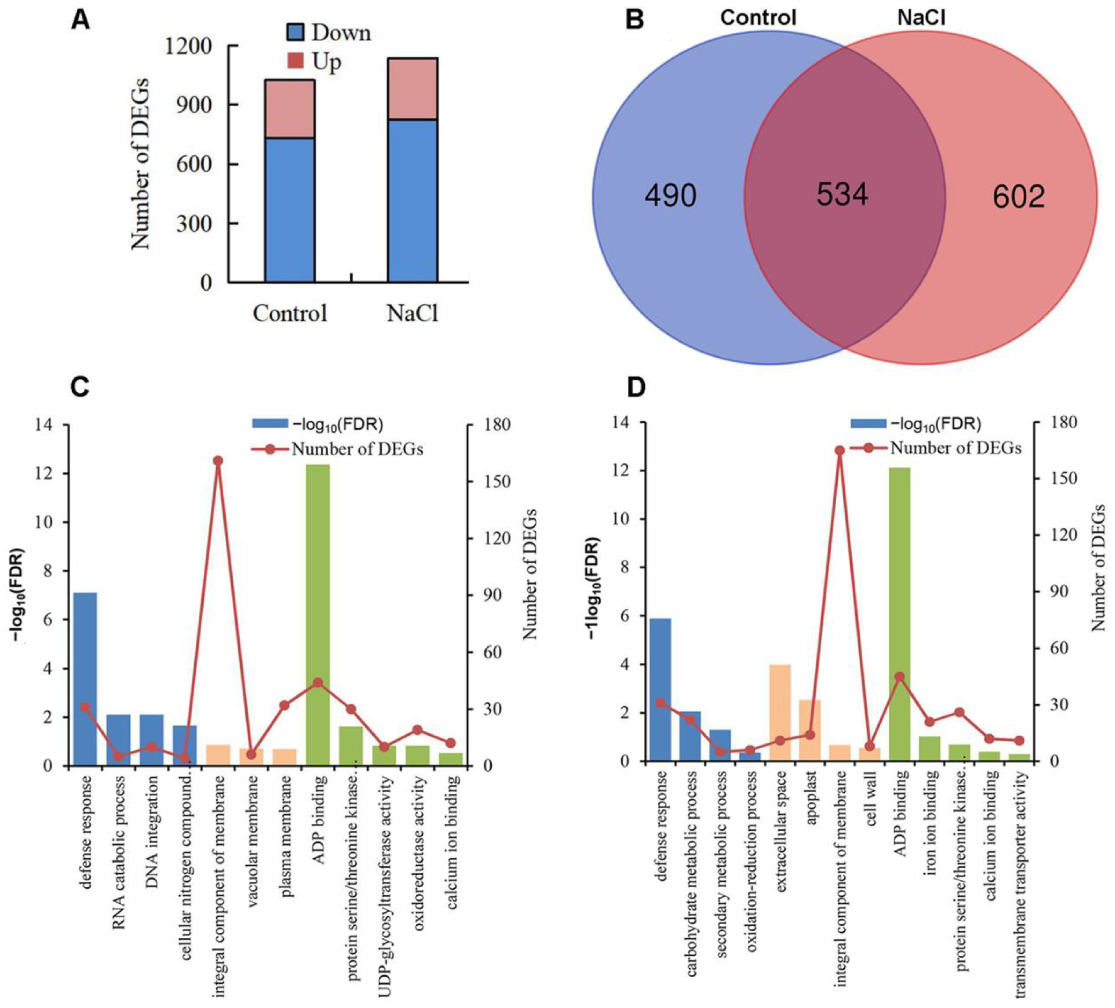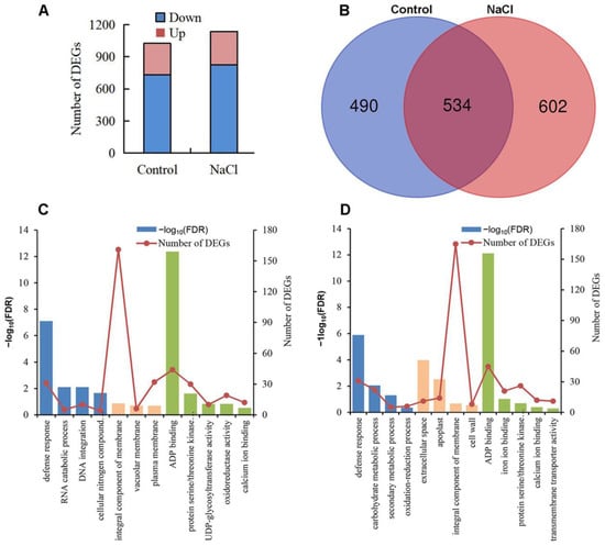 A GO enrichment analysis revealed that the top enriched GO terms under the control conditions included defense response (GO:0006952), integral component of membrane (GO:0016021), ADP binding (GO:0043531), and protein serine/threonine kinase activity (GO:0004674) (Supplementary Table S5, Figure 6C). Under salt stress, the most enriched GO terms included defense response (GO:0006952), carbohydrate metabolic process (GO:0005975), integral component of membrane (GO:0016021), ADP binding (GO:0043531), protein serine/threonine kinase activity (GO:0004674), and calcium ion binding (GO:0005509) (Figure 6D).