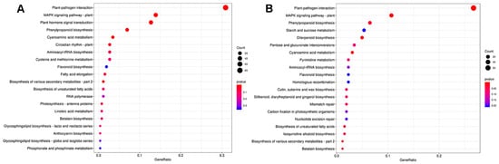To further identify the functions of DEGs in the vps16 mutant compared with DJ under the control and salt conditions, a pathway enrichment analysis was performed using the KEGG database (Supplementary Table S6, Figure 7). Under the control conditions, plant–pathogen interactions (ko04626), the MAPK signaling pathway–plant (ko04016) pathway, and plant hormone signal transduction (ko04075) were predominantly enriched in the vps16 mutant compared to DJ (Figure 7A). Under salt stress, plant–pathogen interactions (ko04626), MAPK signaling pathway–plant (ko04016), phenylpropanoid biosynthesis (ko00940), and starch and sucrose metabolism (ko00500) were predominantly enriched in the vps16 mutant compared to DJ (Figure 7B).