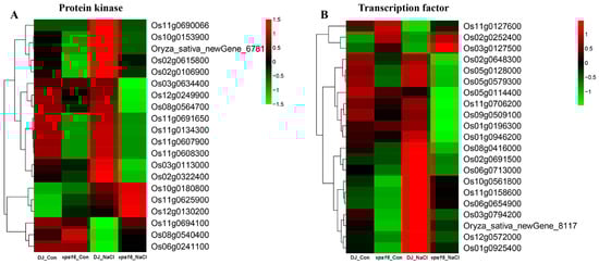 A heatmap of the DEGs associated with protein kinases (PKs, (A)) and transcription factors (TFs, (B)) in the vps16 line relative to DJ (WT) under control and salt conditions.
