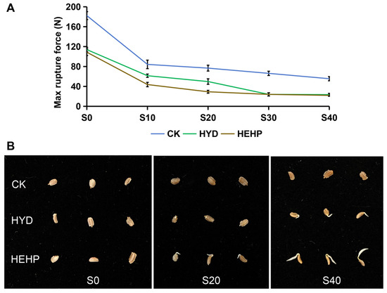 In order to understand the mechanical properties of the endosperm in the early stage of carrot seed germination, the maximum rupture force that the seeds can withstand before rupture was determined at different time points for each treatment. As shown in Figure 1A, the max rupture force of carrot seeds decreases the fastest during the initial 10 h of imbibition, indicating that the max rupture force is closely related to the moisture content of the seeds. Primed seeds (HYD and HEHP) showed consistently lower rupture force than CK from pre-sowing through imbibition. In addition, at the two time points of S10 and S20 in the early stage of imbibition, the max rupture force of HEHP treatment was considerably lower than that of HYD treatment. Based on the germination data from previous studies, HEHP has a significantly better promoting effect on carrot seed germination than HYD [16,22]. The germination phenomenon of seeds treated with HEHP could be observed at S20, earlier than the HYD treatment and CK (Figure 1B).