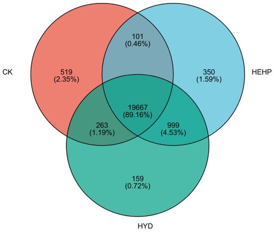 Venn diagram showing specific and overlapping identified genes in carrot (Daucus carota L.) seeds under CK, HYD, and HEHP treatments.