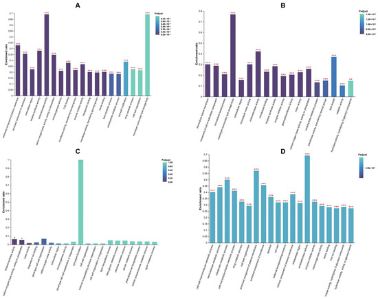 GO enrichment analysis of DEGs in carrot (Daucus carota L.) seeds under CK, HYD, and HEHP treatments. (A) Top 20 enriched GO terms of the DEGs identified in CK vs. HEHP. (B) Top 20 enriched GO terms of the DEGs identified in CK vs. HYD. (C) Top 20 enriched GO terms of the DEGs identified in HYD vs. HEHP. (D) Top 20 enriched GO terms of all the DEGs identified in CK vs. HEHP, CK vs. HYD, and HYD vs. HEHP. * means significant at the level of p < 0.05. ** means significant at the level of p < 0.01. *** means significant at the level of p < 0.001.